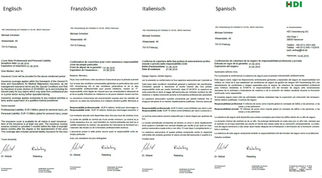 Du planst einen Teil deiner Facharztausbildung im Ausland zu absolvieren? Kein Problem: die Versicherungsbestätigung (auch Police genannt) kannst du auch in den Fremdsprachen Englisch, Spanisch, Französisch und Italienisch erhalten.