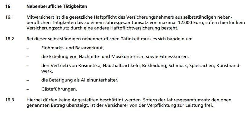 Es handelt sich also lediglich um eine Ausschnittsdeckung. In der Praxis bedeutet das oft, dass man entweder über den Auftraggeber gut versichert sein sollte, eine zusätzliche Betriebshaftpflicht haben sollte oder eine Privathaftpflicht, welche Nebentätigkeiten umfänglicher einschließt.
