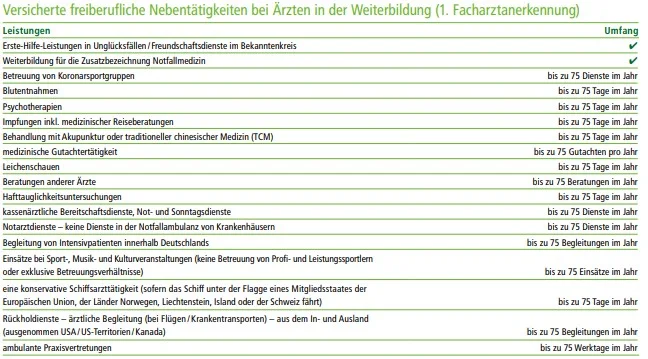 Neben den Tätigkeiten, die du im Rahmen deiner Weiterbildung zum Facharzt/zur Fachärztin ausübst, versichert der HDI auch bis zu 75 zusätzliche nebenberufliche Dienste/Tage pro Jahr. Sollten diese zusätzlichen 75 Tage nicht ausreichen, kannst du gegen Beitrag diese Beschränkung aufheben und auf unbegrenzte Anzahl erhöhen.