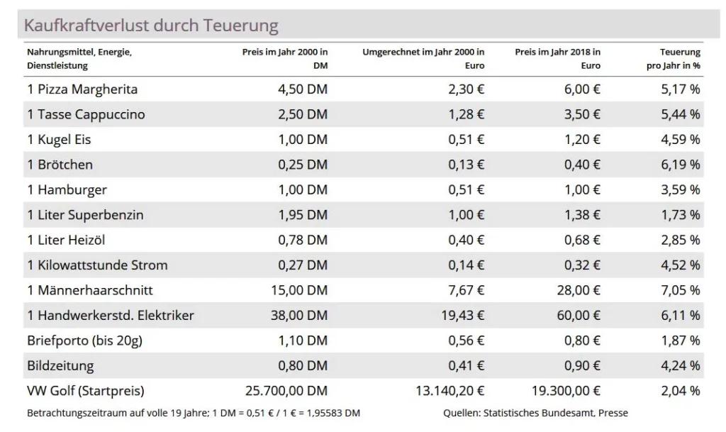 Bitte beachten Sie, dass die Preisangaben exemplarischen Charakter haben und je nach Region und anderen Faktoren variieren können. Die Quelle für die Inflationsdaten ist das Statistische Bundesamt Deutschlands (Quelle). Frühere DM-Preise wurden in Euro umgerechnet.