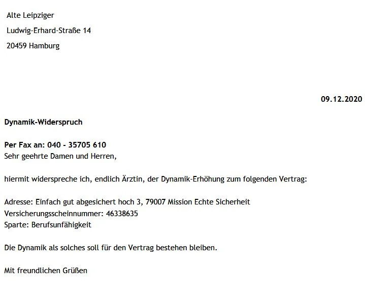 Die Beitragsdynamik ist jederzeit separat kündbar und es kann ihr mit einer großzügig festgelegten Frist widersprochen werden. Eine andere Regelung führt bei den meisten Anbietern ebenfalls zu einem Ende der Dynamik. Die Standardregelung am Markt ist, dass die Beitragsdynamik 2 mal in Folge abgelehnt werden kann, bei einem 3. Widerspruch entfällt das Recht auf die jährlichen Erhöhungen von Leistung und Preis ohne erneute Risikoprüfung. Es gibt auch kundenfreundlichere Regelungen, z.B. bei Alte Leipziger und LV 1871 (Bedingungen seit 05/2020), wo ein Widerspruch beliebig oft erfolgen kann, ohne das Recht zu verlieren. Beim HDI (09/2019) darf 4-mal in Folge widersprochen werden.