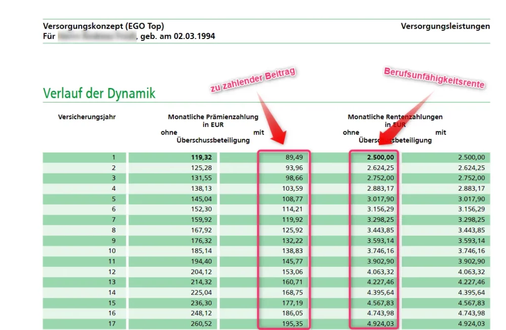 Frühe Dynamiksprünge sind demnach in den allermeisten Konstellationen sinnvoll und wünschenswert. Somit wird zu überschaubaren Preisen ein solider Schutz für den Fall der Berufsunfähigkeit aufgebaut.