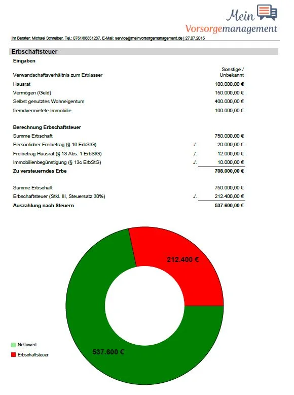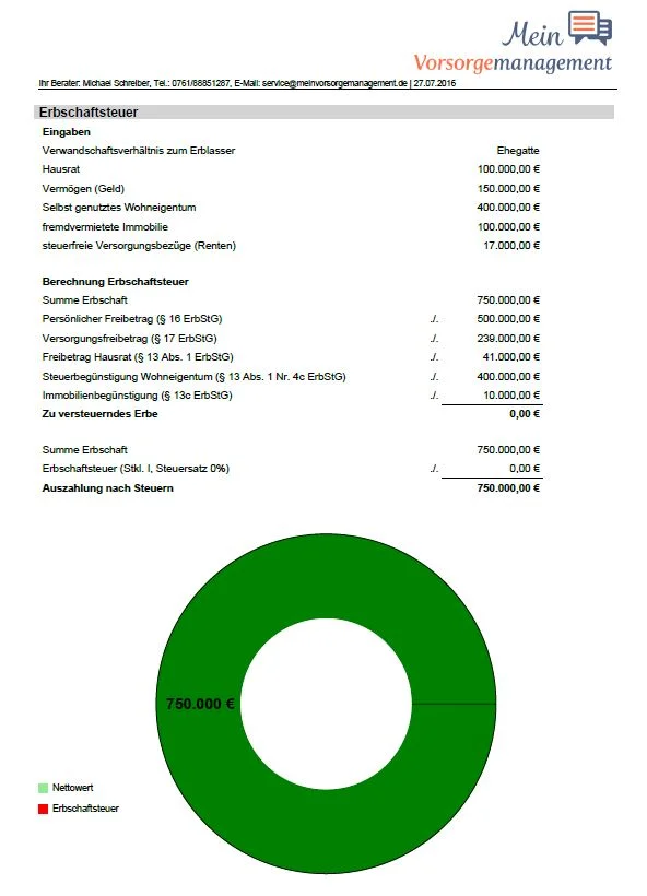Bei Verheirateten sind die Freibeträge sehr hoch (derzeit = 500.000 EUR) und der Steuersatz beträgt lediglich 7 %. Hinzu kommen weitere Freibeträge, z. B. für selbst genutztes Wohneigentum, fremdvermietete Immobilien und Hausrat. Hier mal ein Beispiel über ein Erbe von insgesamt 750.000 EUR, wobei aufgrund der Freibeträge genau 0,00 EUR Erbschaftssteuer anfallen, denn 7 % von null bleiben Null.