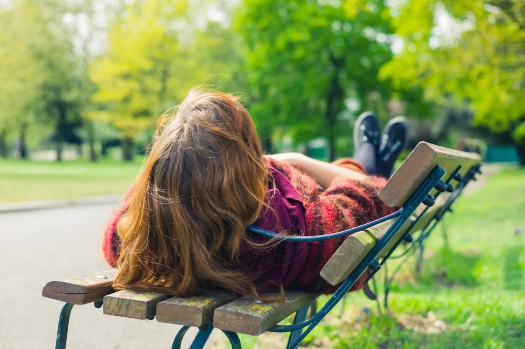 Ob ich wohl eine ganze Bank für mich alleine einnehmen kann? Ich strecke meine Gliedmaßen und lege mich quer über die Sitzfläche. Als wäre das noch nicht genug, tippe ich mit den Fußspitzen auf die Bank daneben. Zum Amüsement meiner Freunde.