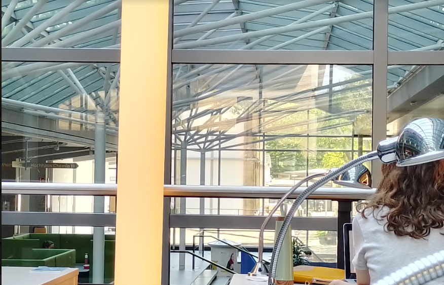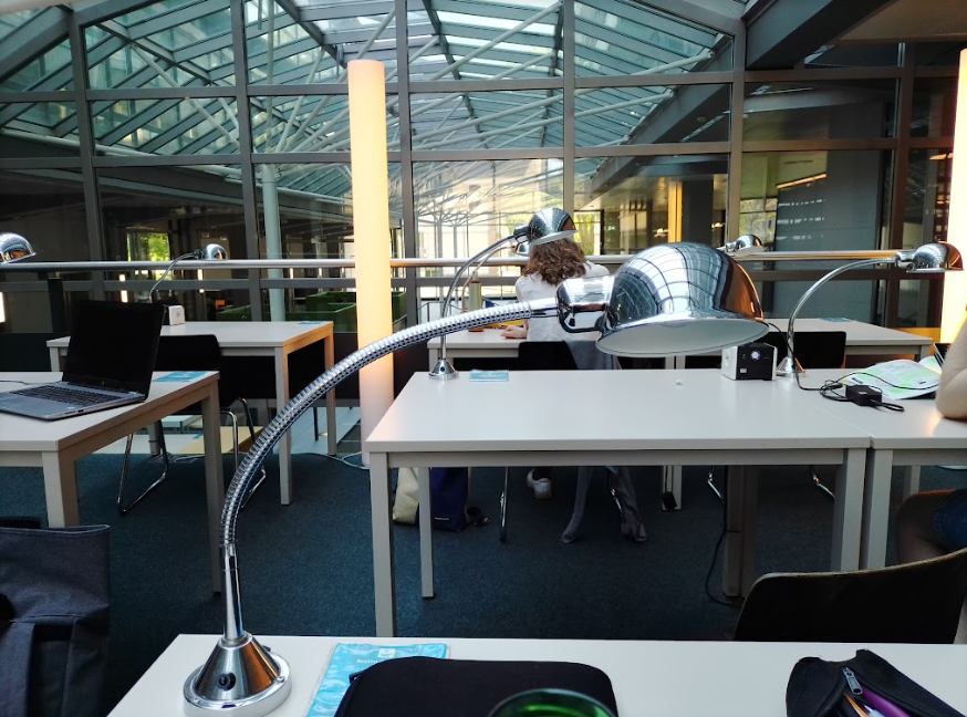 Die Bibliothek hat mich bei Regen immer in ihren Bann gezogen. Doch mittlerweile lerne ich sie auch bei Sonnenschein lieben. Lichtdurchflutet. Das Grün des Institutsviertels schimmert durch die Glasscheiben. Es ist eine wunderschöne Bibliothek. Um Längen schöner als die UB. Sie trifft das perfekte Maß an Modernität und verträumt-vintage.