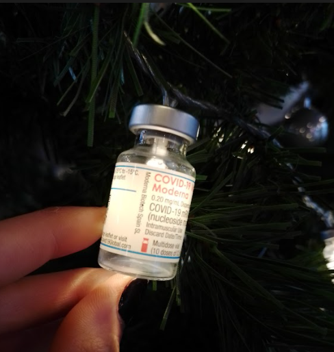 Unbefüllte Impfampullen am Weihnachtsbaum