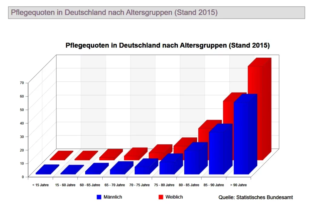 Wie das Bundesamt weiter mitteilt, ist die Zahl der Menschen, die auf fremde Hilfe angewiesen sind, seit 2013 erneut stark angestiegen. Das Plus betrug fast neun Prozent, sodass nun 234.000 Personen zusätzlich auf Pflege angewiesen sind. Das verwundert allerdings kaum, schreitet doch die Alterung der Gesellschaft unvermindert voran. Und betagte Menschen sind nun einmal besonders bedroht, ein Pflegefall zu werden. Auch dies verrät die aktuelle Statistik: 83 Prozent der Pflegebedürftigen waren 65 Jahre und älter. Und mehr als ein Drittel der Betroffenen (37 Prozent) hatte mindestens das 85. Lebensjahr erreicht.