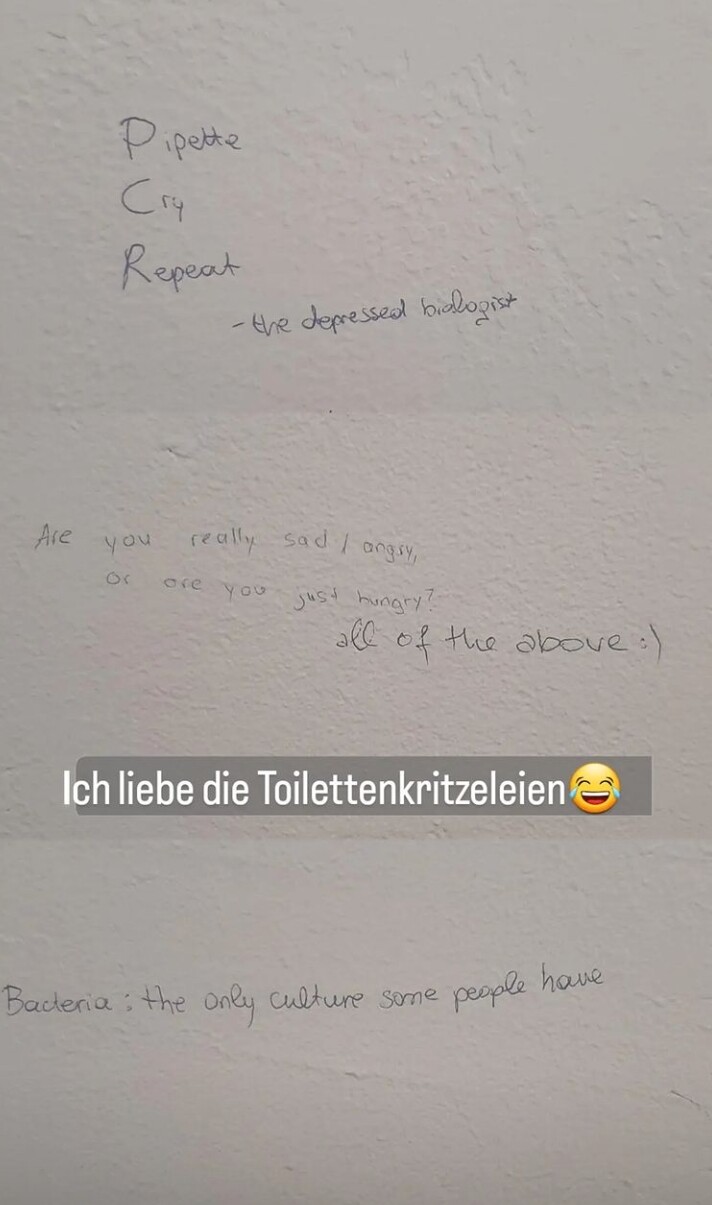 Und wenn man mit der Prüfungsaufsicht nicht so viel Glück hat, bleibt einem beim Lernen in der UB immer noch das unerschöpfliche Spektrum an Wandkritzeleien, um etwas zum Lachen zu haben.