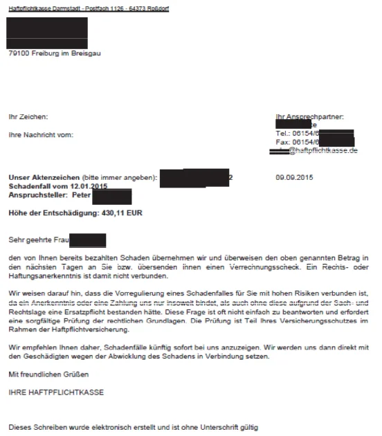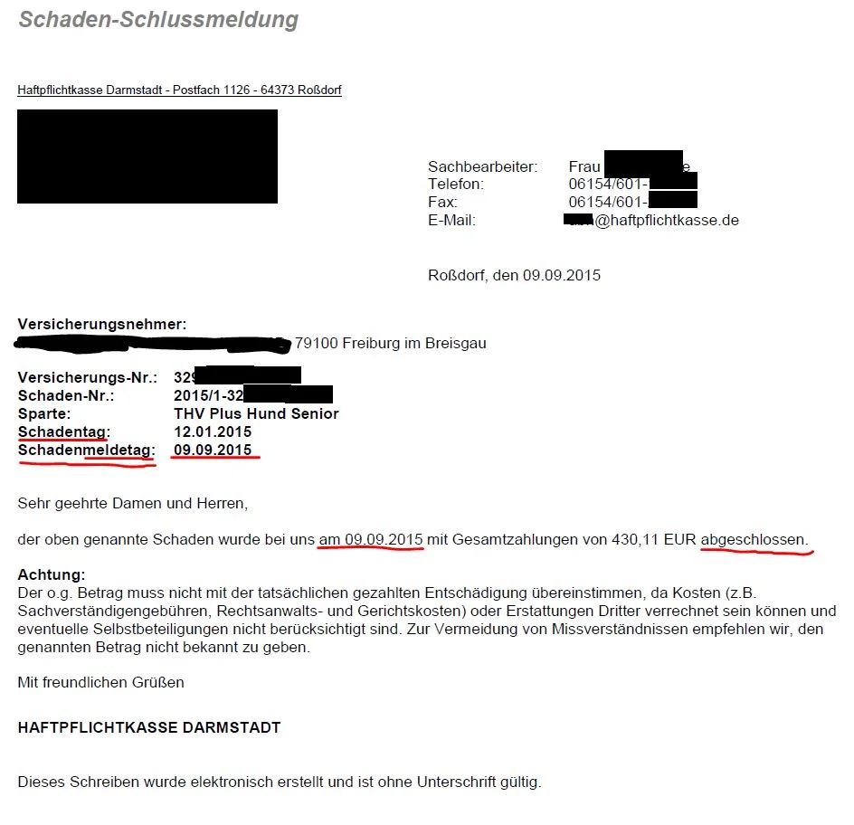 - Schaden durch die Versicherung reguliert am 09. September 2015, also noch am Tag der Schadensmeldung, durch Übernahme und Ausgleich des gesamten Schadens über 430,11 Euro