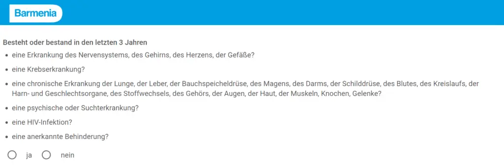 Für 4,90 Euro pro Jahr bekommst du bei der Barmenia einen super Optionstarif, der dir den späteren Zugang zur Krankenvollversicherung bei der Barmenia sichert. Der RSF-Tarif hat, ähnlich wie der Studi.med der Halleschen, eine sehr einfache Gesundheitsprüfung. Du musst nur wenige Fragen beantworten und erhältst trotzdem später Zugang zum Top-Tarif der Barmenia.